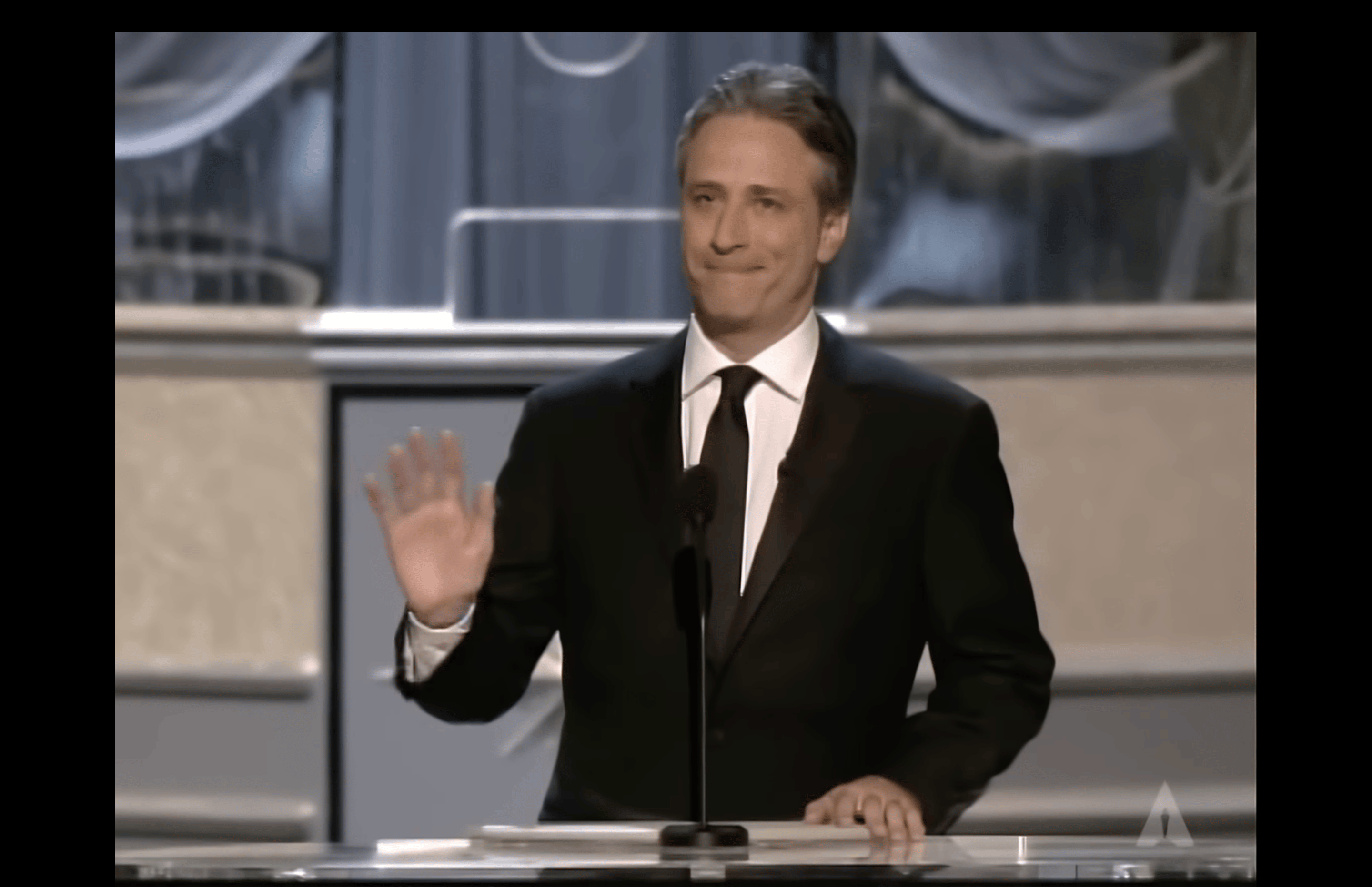 Stewart’s energy is muted and he stands behind a lectern for some reason. He jokes that there are hundreds of millions of people watching the broadcast from around the world (when’s the last time that was actually true?) and that half of those people are in the process of being adopted by Angelina Jolie.