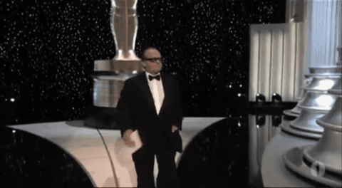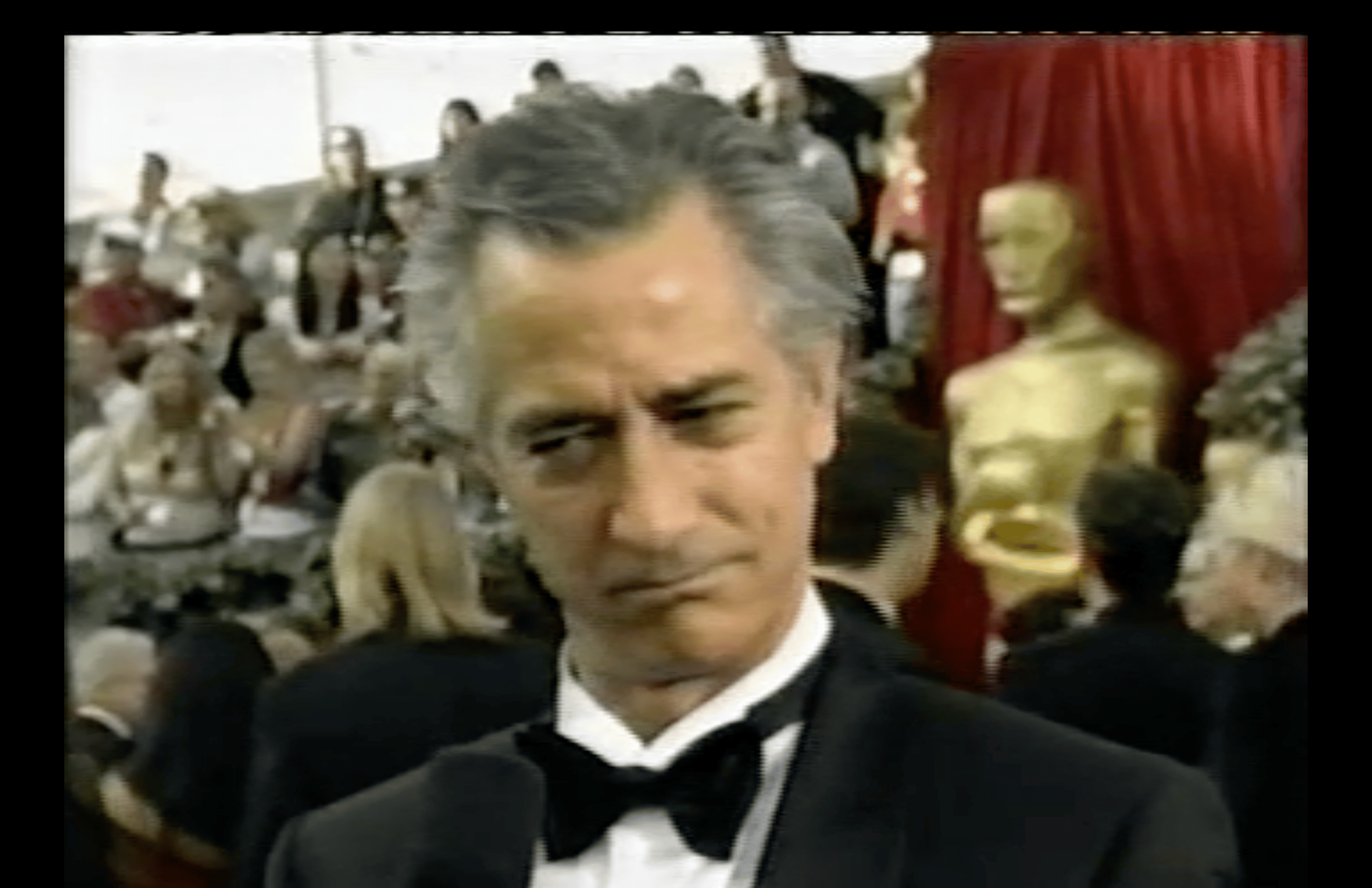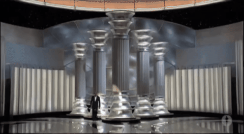 Once we’ve climbed our way out of the uncanny valley, we get some old-fashioned pre-taped comedy. The announcer says, “Ladies and gentlemen, please welcome your host, Billy Crystal.” And then Billy pops out of the Brokeback tent and says he can’t do it this year. “I’m a little busy.”