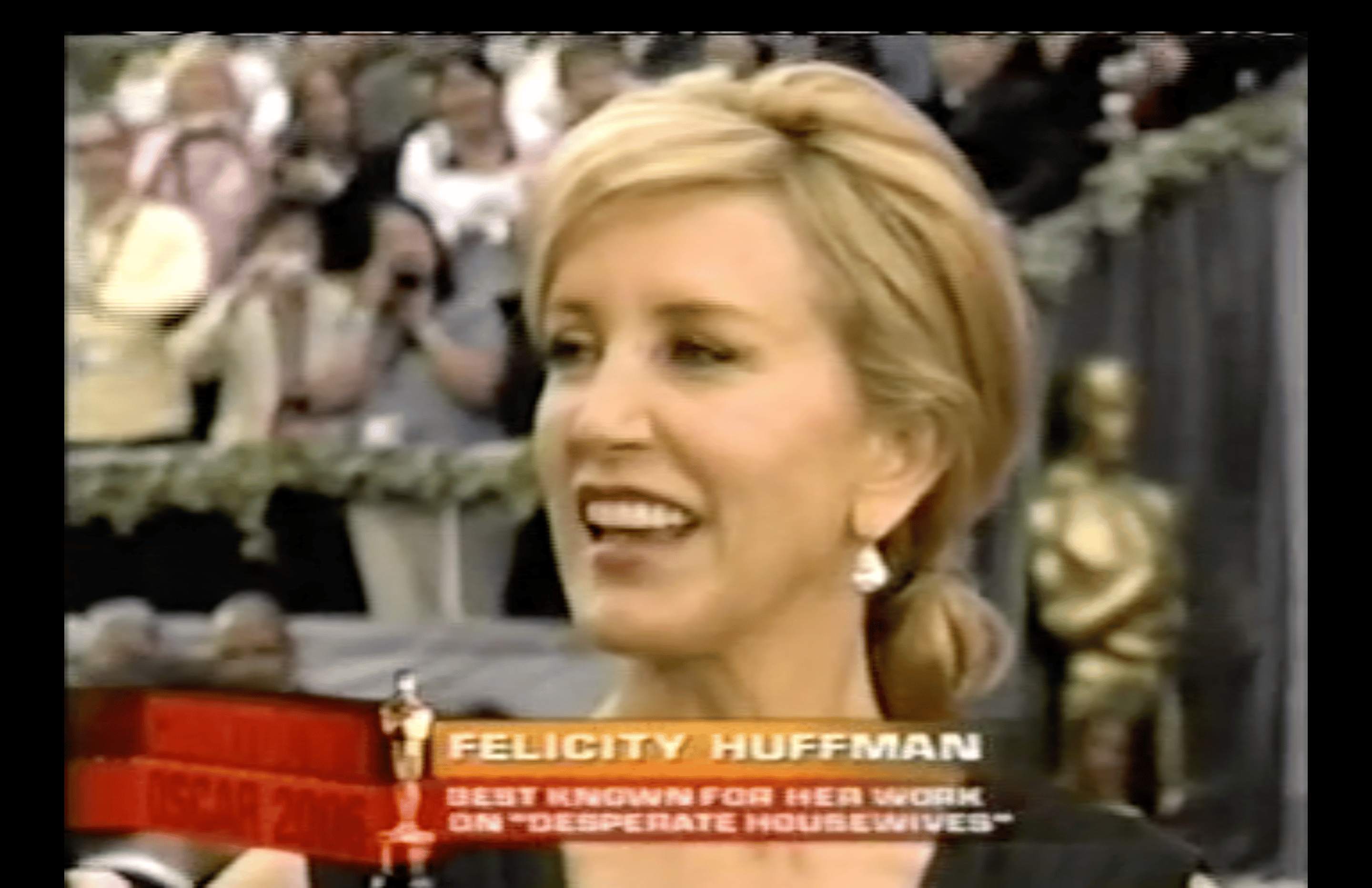 After that beautiful package, it’s back to Chris Connelly who is joined by Transamerica best actress nominee Felicity Huffman. Everyone back then spoke perfectly about trans issues, as is reflected in Huffman’s film. To wit, Connelly saying of Huffman’s vocal affect: “Your voice, very disconcerting for a lot of people. What was your low voice like for the people in your life to listen to?”