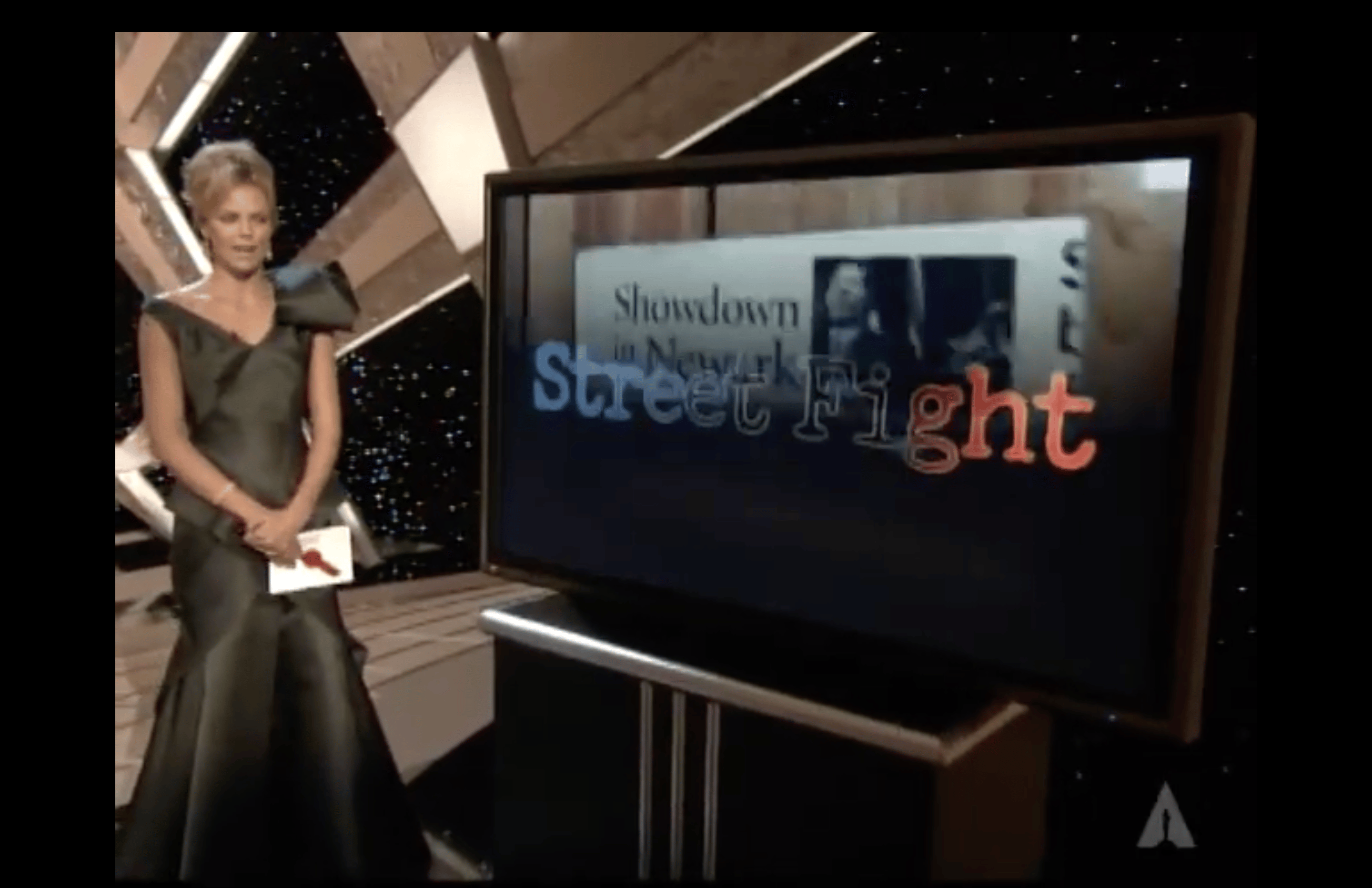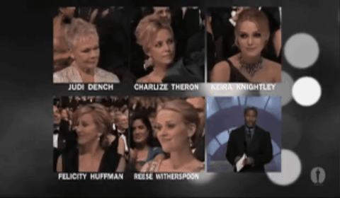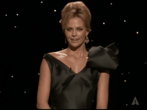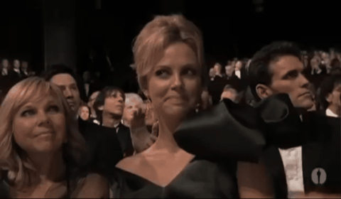 Apparently the theme of this Oscars ceremony was “a return to glamour,” which Stewart mocks by saying it’s better than the previous year’s theme, “Night of a Thousand Sweatpants.” Charlize Theron is not amused!