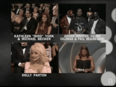Crash wins, ugh, and Paul Haggis and Robert Moresco go up to accept their award. While Haggis speaks, we see various members of his cast watching in appreciation. Plus some people who weren’t involved. Do you think this is the only time in human history that Matt Dillon, Ludacris, and Frances McDormand have sat rapt with attention as they listen to a future apostate of Scientology give a speech?