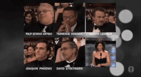It’s, uh, really depressing that two of the nominees here are now dead. Sensing you are sad, Joaquin Phoenix turns to camera and says, “I love you” and then something else.