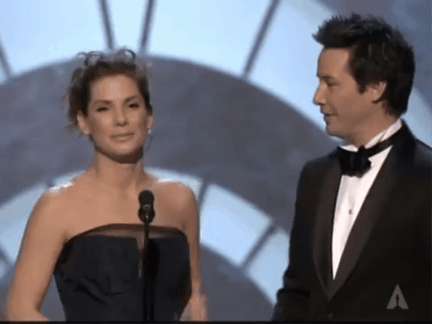 We cut to commercial and when we return it’s time for Sandra Bullock and Keanu Reeves to present best art direction. They are paired together to promote the upcoming The Lake House, but it looks like they’ve been doing a little side project of their own backstage.
